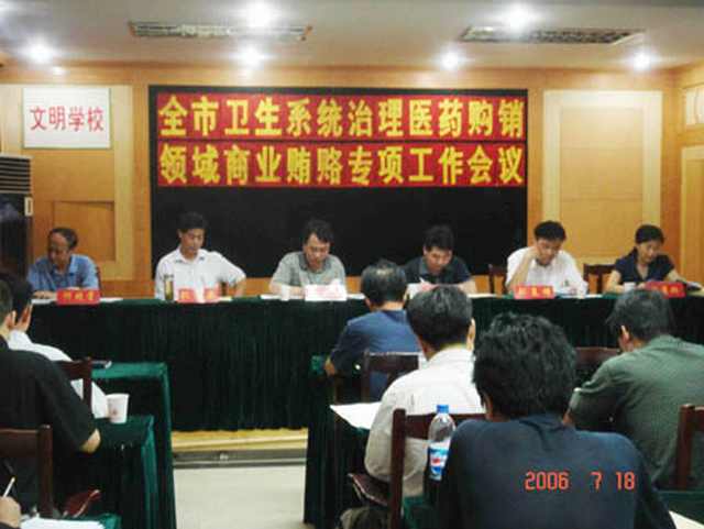 7月18日,全市卫生系统治理医药购销领域商业贿赂阶段性工作总结会议在市红十字中心血站召开,市卫生局主持全面工作的副局长兼纪检组长陈建淮,各县(区)卫生局局长、纪检组长,各县(区)直县级医疗机构负责人,市直相关单位领导、纪检负责人及局机关有关科室负责人参加了会议;市纪委常委、秘书长、市治理商业贿赂委员会副主任、办公室主任张少强,市政府纠纷办主任、市治理商业贿赂委员会办公室副主任刘复明出席了会议。会议由市卫生局副调研员何晓学主持。 市卫生局人事科长、监察室主任汤秀琳同志传达了省、市、治理医药购销领域商业贿赂会议精神;市人民医院、各县(区)卫生局介绍了本单位、本系统宣传发动及教育阶段的工作做法和经验。各级医疗机构结合实际进行讨论性发言。 陈建淮副局长就全市治理医药购销领域商业贿赂工作作了阶段性总结讲话。他指出,全市各级卫生行政部门和医疗机构在前一阶段治理医疗机构领域商业贿赂中都开展了实实在在的工作,取得了显著的效果。他最后强调,各单位要进一步提高认识,抓好自查自纠,严肃查处医疗购销领域商业贿赂案件,针对存在问题,全面整改提高。 市纪委常委、市治理商业贿赂委员会副主任兼办公室主任张少强到会并作了重要讲话。