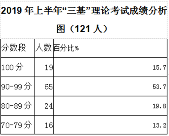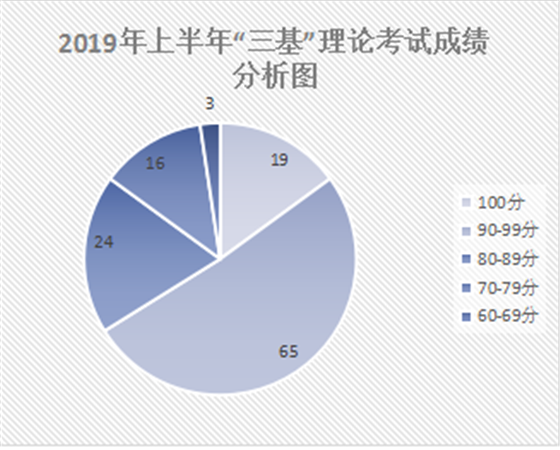 大家通过手机端在线考试系统,仅需碎片化时间学习、练习,就能轻松通过考试,极大的提高了专业技术人员的主动学习能力;本次“三基”考试全员过关,进一步为我院医疗技术水平和医疗服务能力打下了坚实的理论基础。(附成绩分析图)
