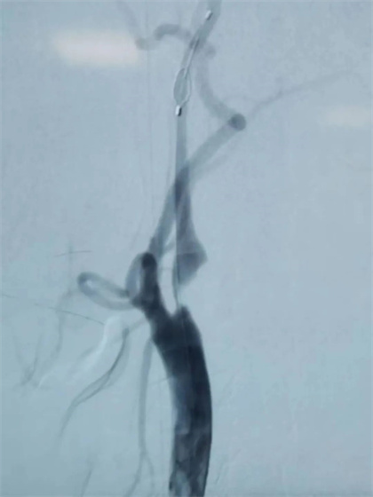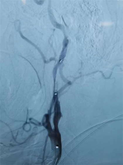 患者 刘某某,男性 68岁,因“急性脑梗死”在我院神经内科住院治疗,入院头颅CTA、CTP检查发现,病人左侧颈内动脉起始部接近闭塞,只有线样血流,同侧大脑半球大片低灌注区。入院后经强化的药物治疗,患者的症状仍有波动,时常出现言语不清、肢体无力加重等症状。神经内科科内讨论认为:病人的左侧颈内动脉起始部极重度的狭窄,同侧颅内血流动力学不稳定,如果不采取有效的措施,患者的颈内动脉有随时完全闭塞的风险,脑梗死会进一步加重,从而导致严重的失语、偏瘫症状,那对病人及其家庭将是一场灾难。经与患者家属沟通后,于3月4日上午,神经内科介入团队盛守权主任、张国柱副主任医师成功为患者实施颈动脉球囊扩张和支架置入手术,术后病人颅内供血立即改善,症状波动消失,现已经康复出院。