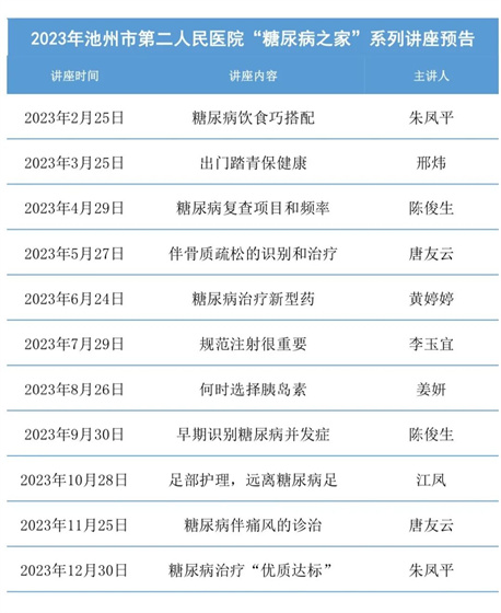 池州市第二人民医院将于2023年继续开展“糖尿病之家”糖尿病健康教育系列讲座,为广大池州市民提供更多、更科学的防治慢性病的相关知识。讲座过程中,我们将进行免费血糖检测、血压检测、发放宣传手册、提供咨询和糖尿病患者诊治所需小物品,具体课程安排如下: