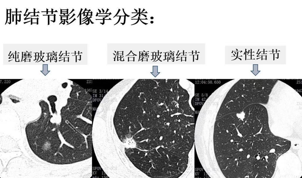 “肺结节”就是肺组织里的一个小肿块,影像学表现为肺内直径≤3cm局灶性、类圆形、密度增高的实性或亚实性肺部阴影;大于3厘米的称肺部肿块。肺结节依其密度不同可分为实性结节、混合磨玻璃结节、纯磨玻璃结节,“打个比方肺相当于水,而上面提到的各种结节分别相当于石头、有石头的沙子、纯沙子。”