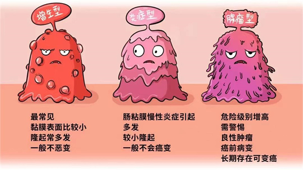 肠息肉按病理特征分为炎性息肉,增生性息肉,腺瘤性息肉(包括锯齿状腺瘤、管状腺瘤、绒毛状腺瘤以及管状-绒毛状腺瘤)等。炎性息肉及增生性息肉等属于非肿瘤性息肉,直径一般小于 5mm,癌变的概率很低,切除的必要性不大。值得重视的是腺瘤性息肉。研究发现,有超过 70%的结直肠癌来源于腺瘤性息肉。遵循腺瘤伴有低级别上皮内瘤变、腺瘤伴有高级别上皮内瘤变、早期癌,进展期癌的发展规律,恶变过程一般需要 5-10 年时间(当然也存在一些进展较快的病例)。实践已经表明,发现和切除结直肠腺瘤性息肉能够降低结直肠癌的发生率和死亡率!