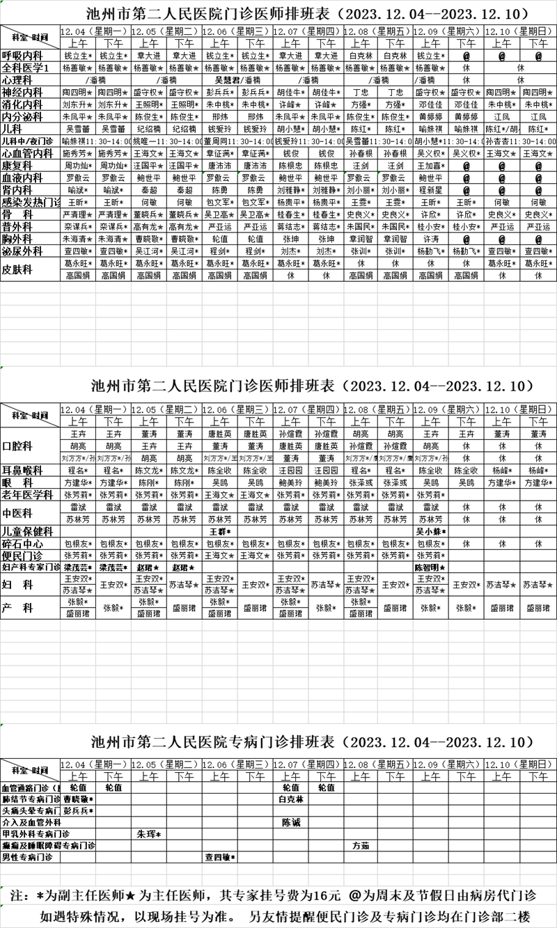 >> 池州市第二人民医院门诊医师排班表(2023.12.04--2023.12.10)