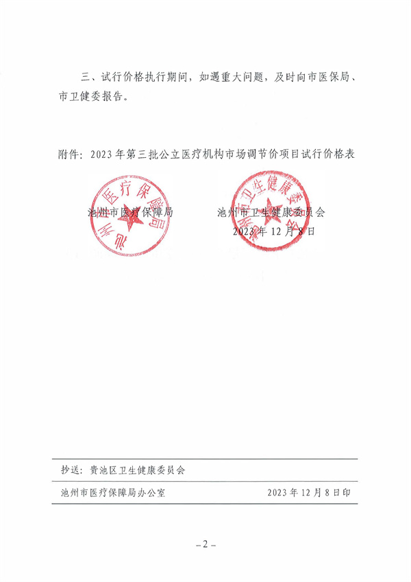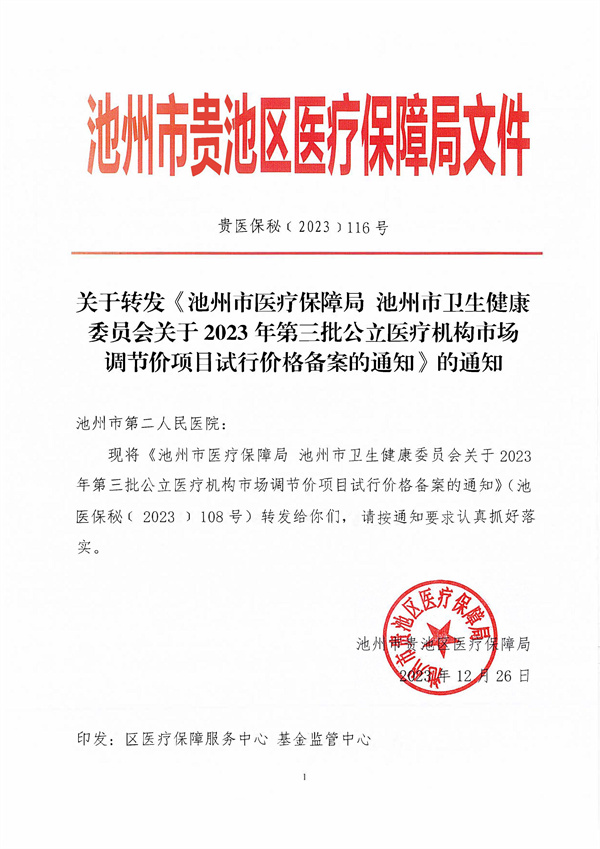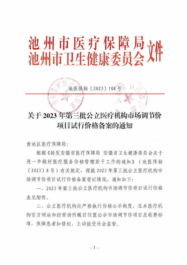 关于转发《池州市医保局池州市卫健委关于2023年第三批公立医疗机构市场调节价项目试行价格备案的通知》