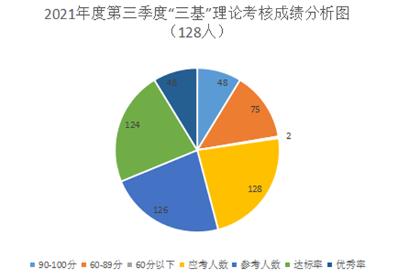 本次“三基”考试内容为各专业基础理论知识100单项选择题,及格分为60分,考试达标率97%,优秀率达38%90分)。(附成绩分析图)