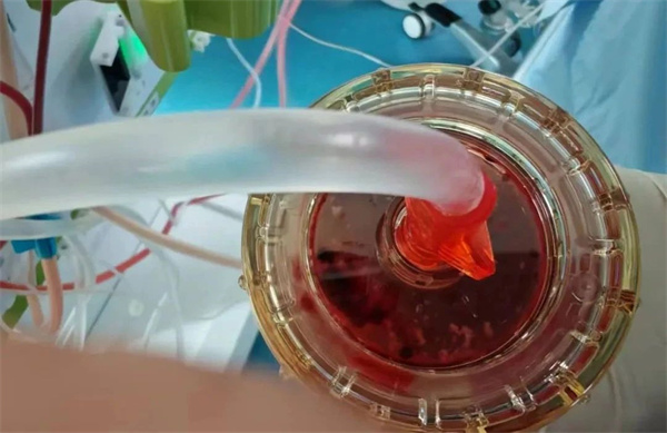要控制住该患者的病情进展,就必须快速清除血脂。立即予以暂禁食水、胃肠减压、液体复苏、积极抗感染、降血脂、改善胰腺微循环、控制血糖、清除自由基、PPI联合生长抑素保护胃粘膜及降低胰腺分泌水平、乌司他丁抑制胰蛋白酶、弹性蛋白酶等一系列治疗,同步间断血液灌流及序贯CVVH以清除患者血脂及炎症介质。患者引流的血液黏稠,灌流器中明显可见脂肪颗粒。治疗过程中,姚主任团队时刻关注患者情况,调整机器参数,及时补充抗凝物质,保证患者生命体征平稳。7月12日,成功置入可视化鼻肠营养管以早期唤醒肠道(该技术应用为池州首例)。经过重症医学科的精心治疗,患者病情明显好转,治疗后复查血脂:甘油三酯7.78 mmol/l,总胆固醇8.99mmol/l。目前患者生命体征稳定,未发生多器官功能损害,已转回普外一科继续治疗观察。