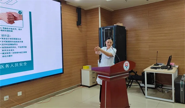 院感科胡桂银老师为大家带来院感知识的专业培训。胡老师详细讲解了手卫生的重要性以及个人防护用品的正确使用方法等,使志愿者们对院感知识有了新的认识和更加深入的了解。