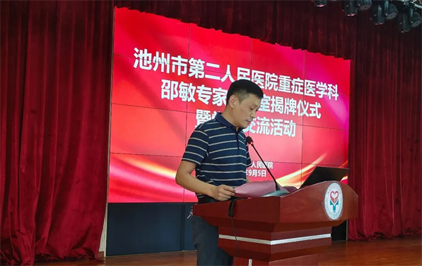 朱珲首先代表医院向长期以来关心支持市二院重症医学事业发展的各级领导和安徽医科大学第一附属医院邵敏专家团队表示衷心的感谢。朱珲表示,我院重症医学科(ICU)成立于2009年,在科主任姚力的带领下,从当年的7张床位,发展到现有标准重症监护床位17张,2023年获批为池州市重点专科。通过邵敏专家工作室揭牌,是持续推进我院重症医学科学科建设,提升急危重症患者救治能力,提高重症创伤救治水平,全力推进“创伤中心”的重要举措。