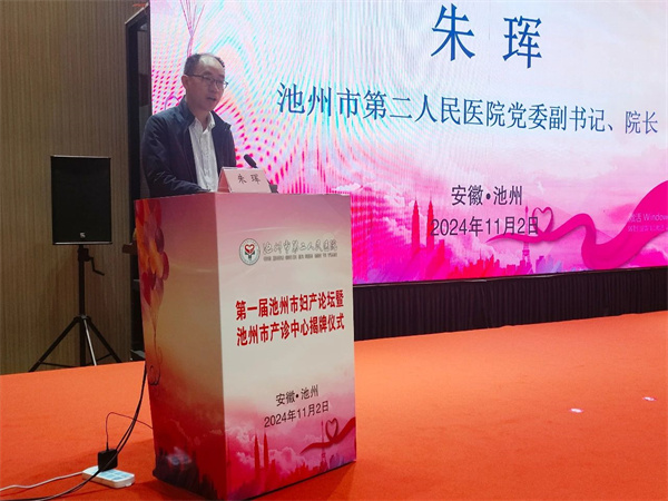 仪式开始,朱珲首先致欢迎词,对莅临本次会议的领导、专家和同仁表示诚挚欢迎与衷心感谢。他表示,医院将秉承“关爱母婴健康,守护生命起点”的宗旨,利用好池州市产诊中心平台,与全市预防出生缺陷工作者携手,共同为池州市卫生健康事业高质量发展助力,为打造健康池州贡献力量。