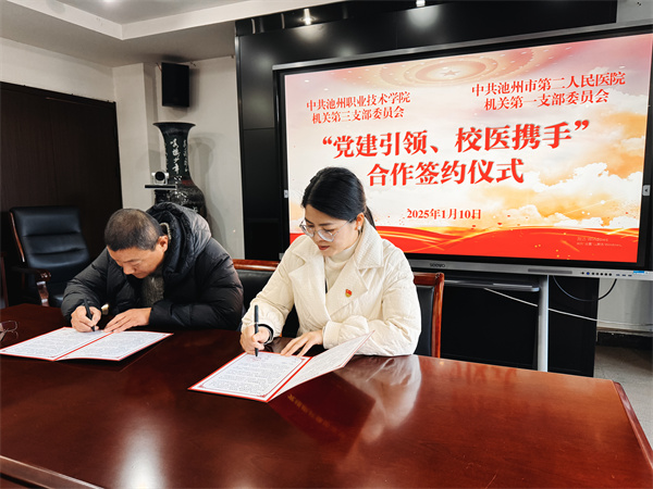 为深入学习贯彻党的二十届三中全会精神,落实新时代党的建设总要求,进一步夯实基层党建工作基础,实现基层党组织之间优势互补、创新发展,2025年1月10日,我院机关第一党支部与池州职业学院机关第三党支部举行结对共建签约仪式。池州职业技术学院党委委员、副院长查正东,我院党委书记章胜华,机关党总支负责同志以及双方党支部支委委员参加了签约活动。