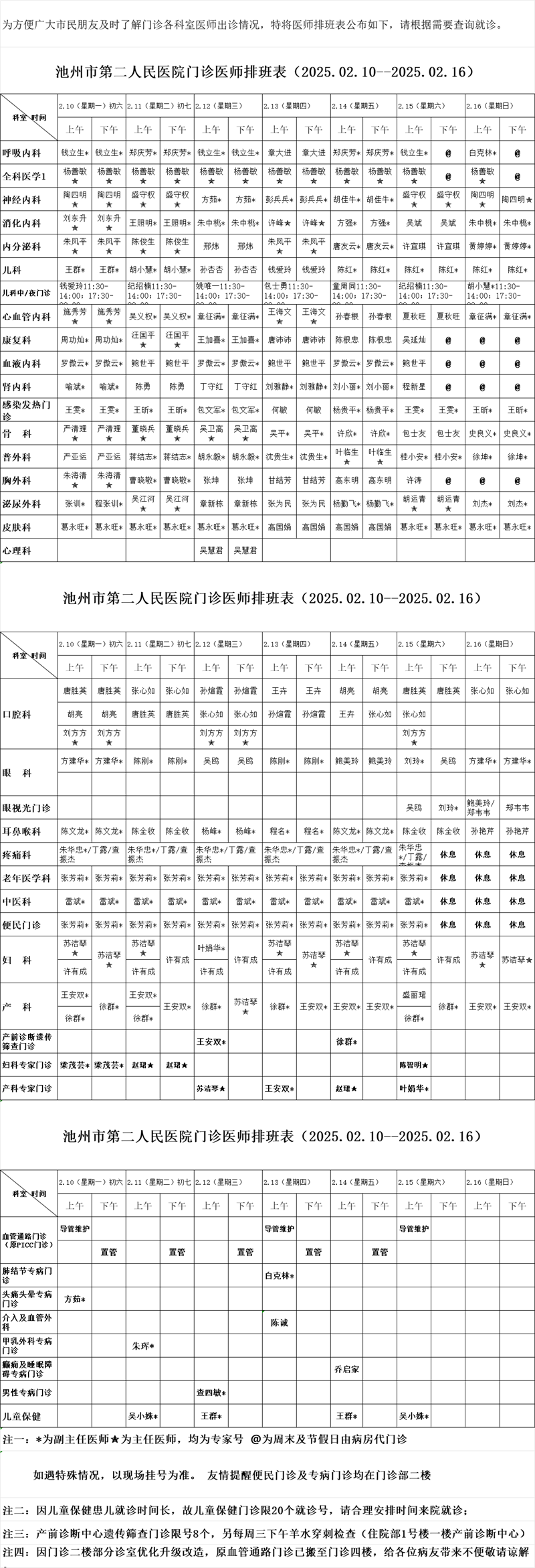 池州市第二人民医院门诊医师排班表(2025.02.10--2025.02.16)