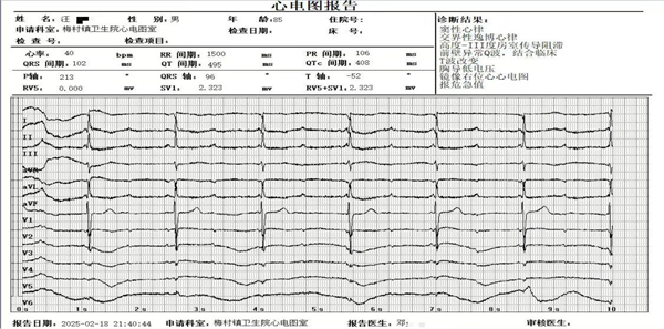 汪大爷因“反复胸闷气喘1周伴头昏”在当地卫生院就诊,心电图检查显示高度-III度房室传导阻滞(心室率40次/分)和镜像右位心心电图。由医共体转诊中心转至我院进一步诊治。入院后,行24小时动态心电图和心脏彩超检查发现,患者不仅患有II度房室传导阻滞,呈2:1下传(最慢心率35次),交界性逸搏伴干扰性房室分离。彩超更是发现汪大爷还是一位罕见的镜面右位心,其心脏及腹腔内脏器官位置与正常人完全相反,如同正常脏器的 “镜中像”,这种先天性畸形的发生几率约为1/100万。