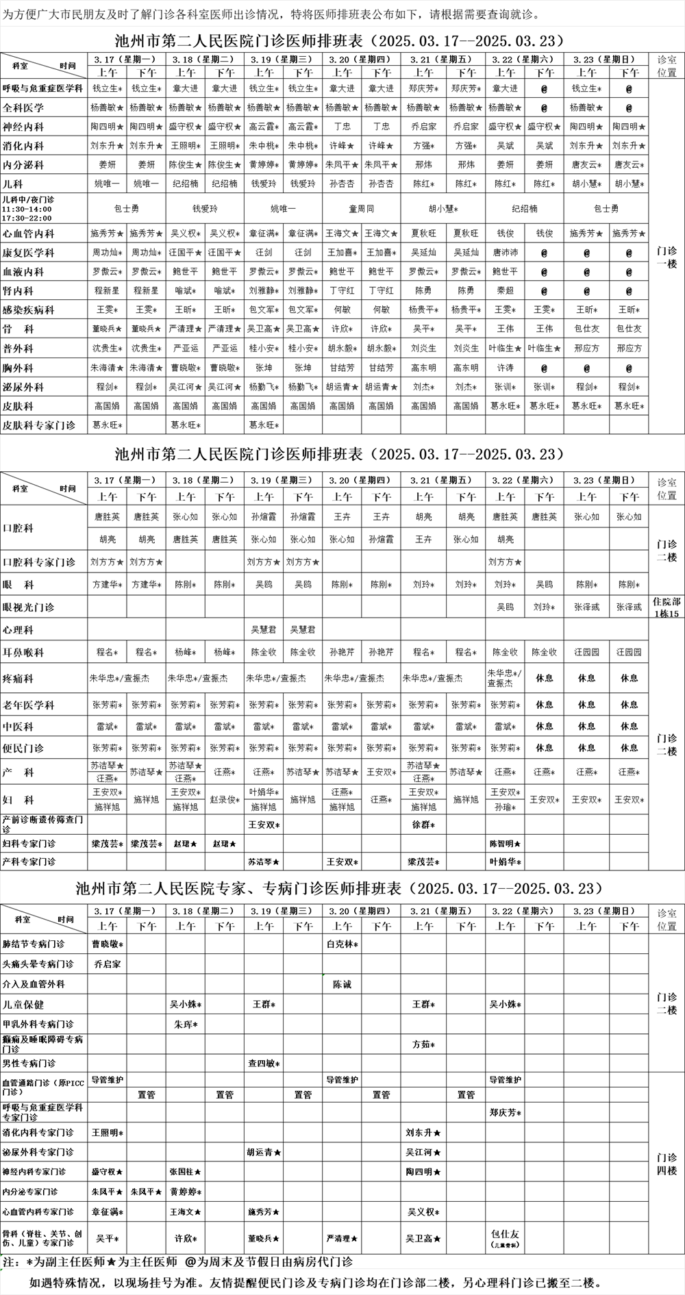 >> 池州市第二人民医院门诊医师排班表(2025.03.17--2025.03.23)