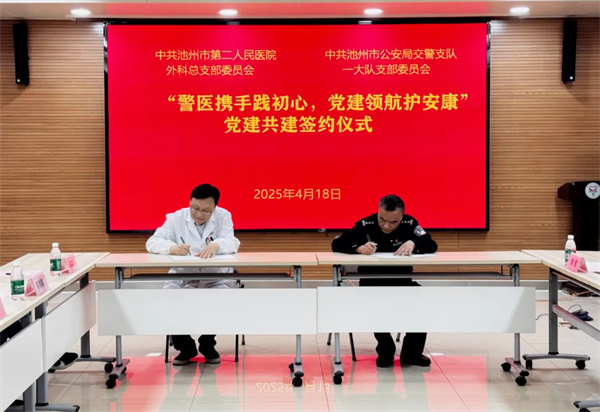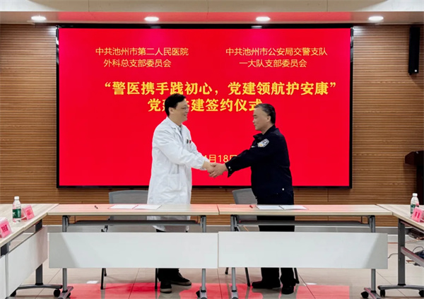 会上,池州市公安局交警支队一大队党支部书记、大队长胡斌,我院外科党总支书记左治强分别介绍党组织建设情况,分享党建工作经验和做法,并签订党组织结对共建协议书。