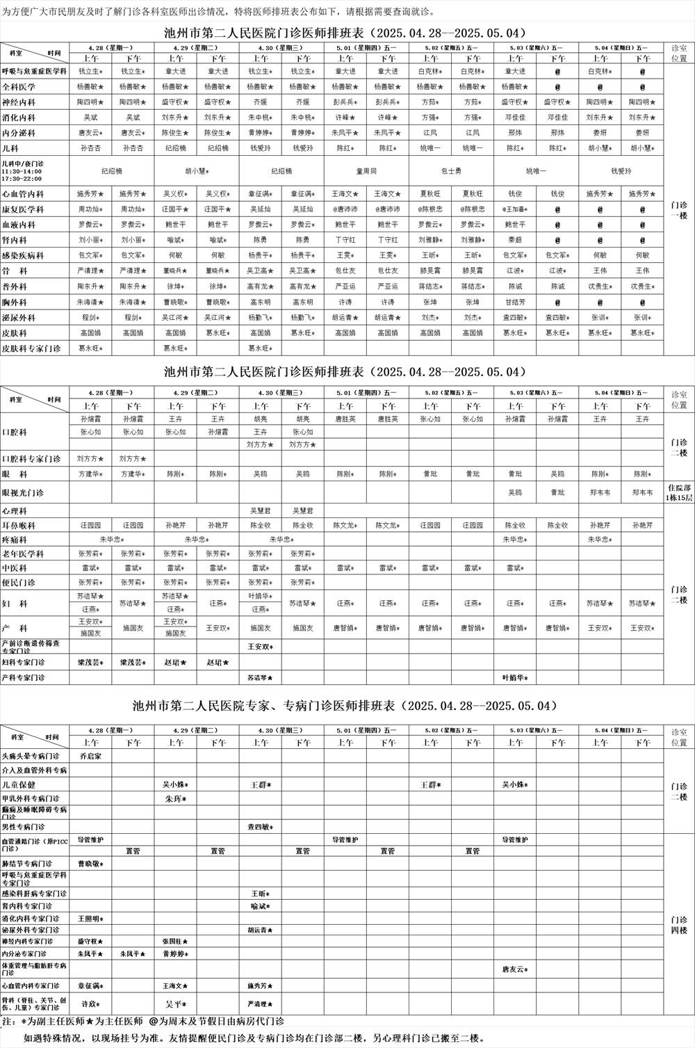 >> 池州市第二人民医院门诊医师排班表(2025.04.28--2025.05.04)