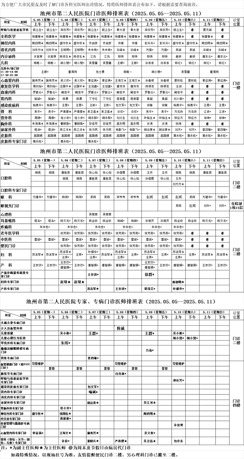 池州市第二人民医院门诊医师排班表(2025.05.05--2025.05.11)