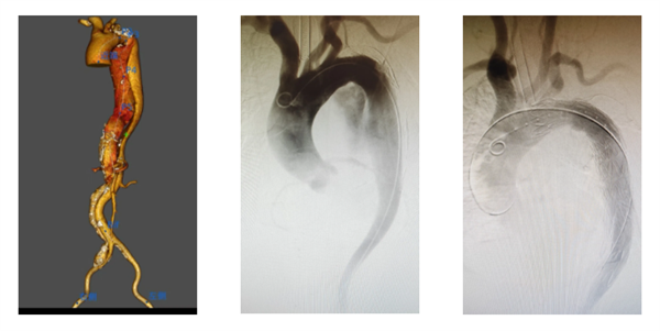 患者为老年女性,夹层动脉瘤瘤体直径达6.8cm,第一破口紧邻左侧锁骨下动脉,夹层一直累及右侧髂动脉,同时,患者合并房颤、高血压等基础疾病。传统手术创伤大、风险高。面对挑战,安医二附院血管外科专家团队与我院多学科紧密协作,经充分术前讨论,最终确定采用TEVAR联合预置缝合器技术。手术全程仅耗时20分钟,无切口,术后患者生命体征平稳,术后首日即可自主下地活动,目前已进入康复阶段,患者及家属对治疗效果十分满意。