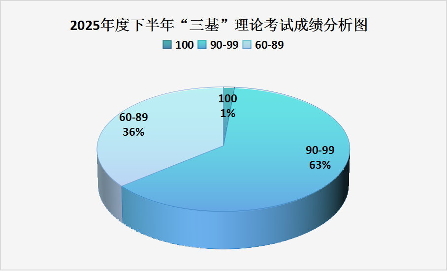 本次“三基”理论考试内容为各专业基础理论知识,考题为100道单项选择题,及格分为60分,考试达标率97%,优秀率64%(≥90分)。(附考试结果分析图)