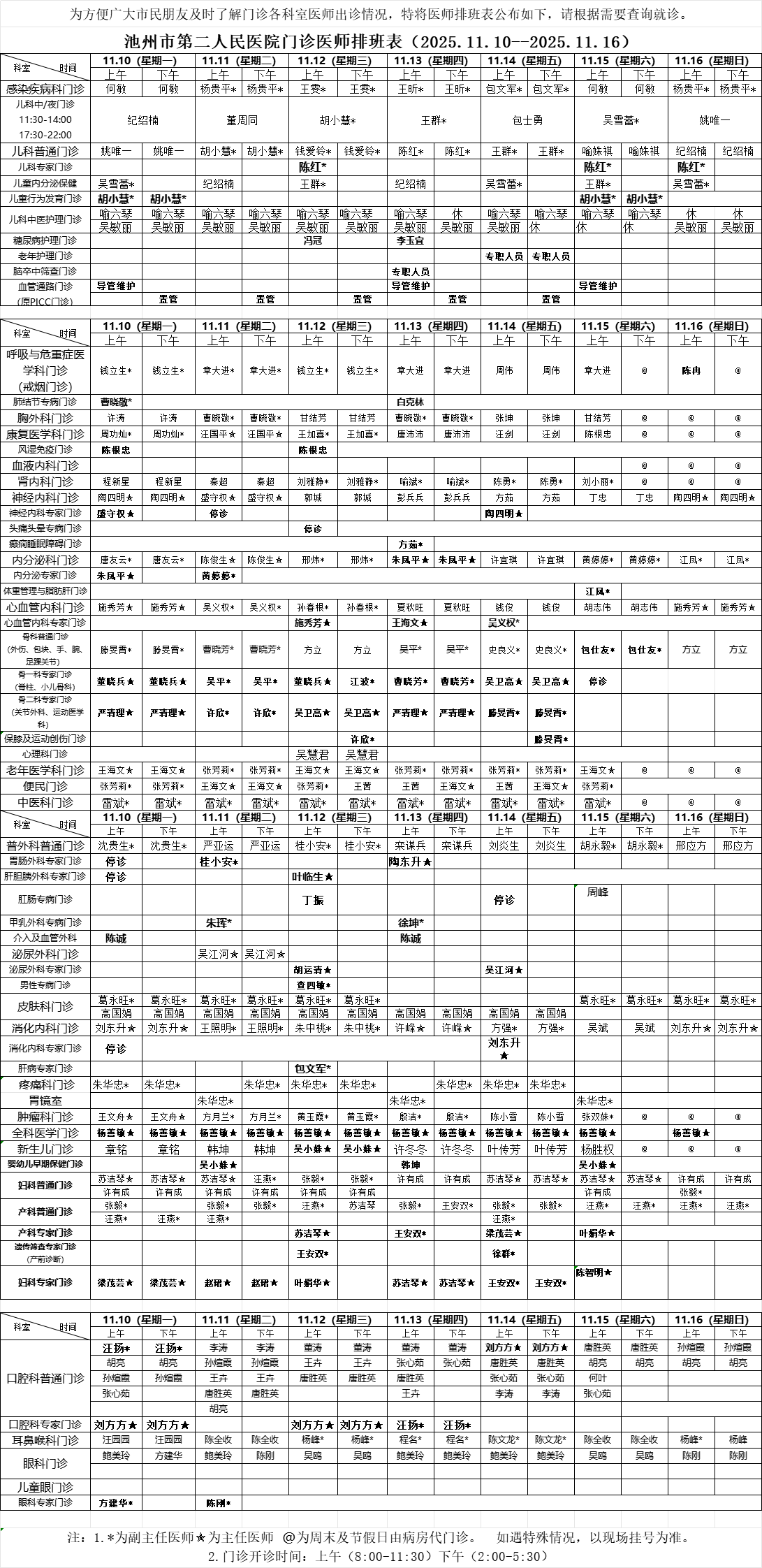 池州市第二人民医院门诊医师排班表(2025.11.10--2025.11.16)