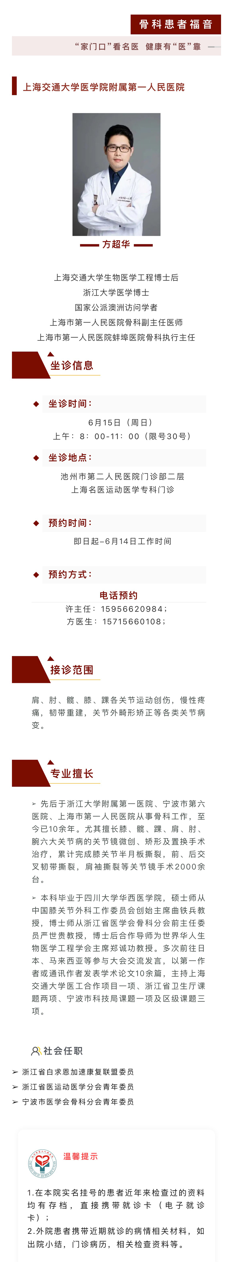 关注!本周日,上海交通大学医学院附属第一人民医院运动医学科博士后方超华来我院坐诊、手术