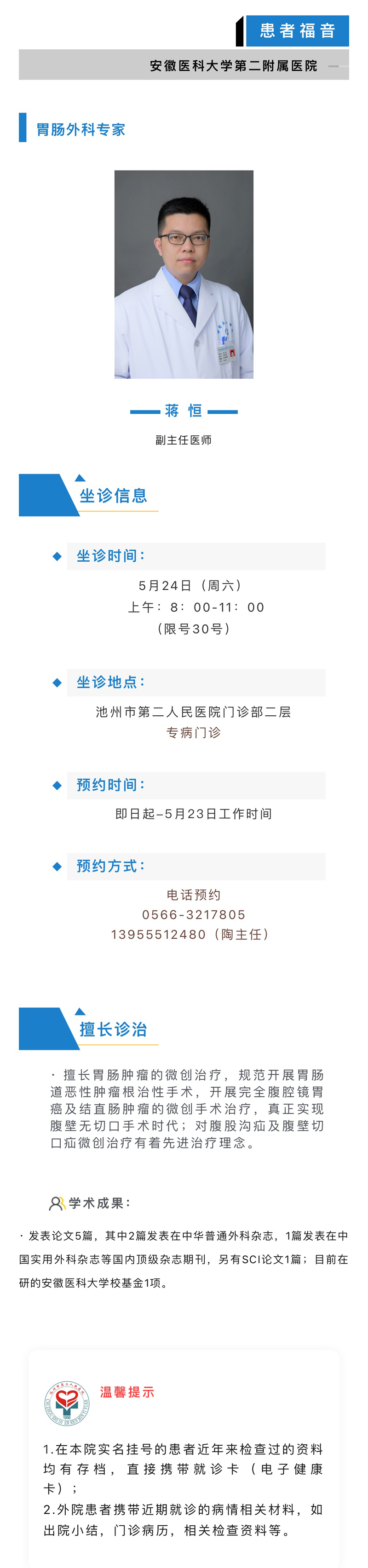 关注!5月24日,安徽医科大学第二附属医院胃肠外科专家蒋恒来院坐诊、手术