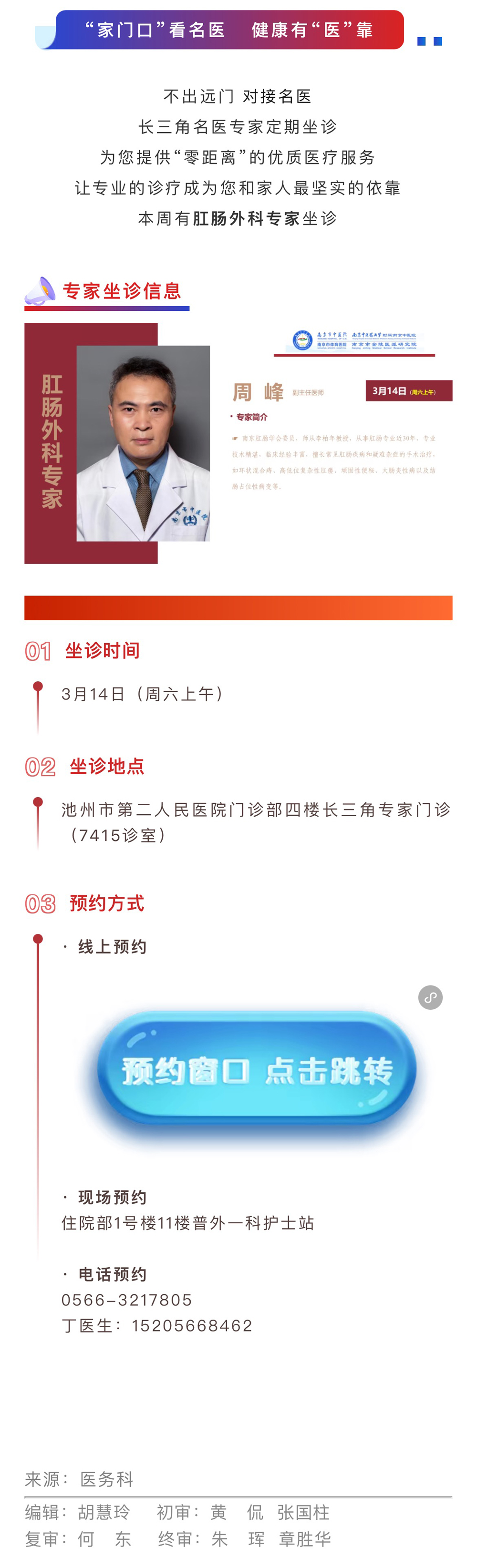 >> 【专家坐诊】3月14日,全国肛肠专科医疗中心——南京市中医院肛肠中心周峰主任坐诊我院