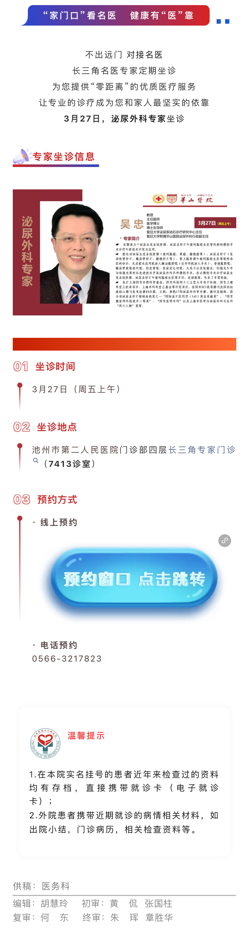 【名医坐诊】3月27日,复旦大学附属华山医院泌尿外科吴忠教授来院坐诊