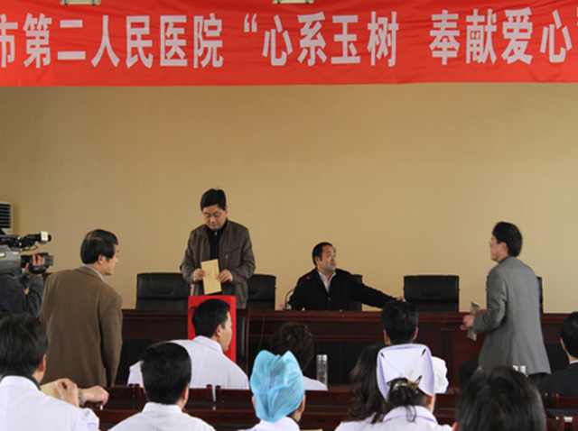 青海玉树的地震灾情牵动着市二院全体职工的心。4月23日下午,我院广大职工慷慨解囊,奉献爱心,向灾区捐款48420元。