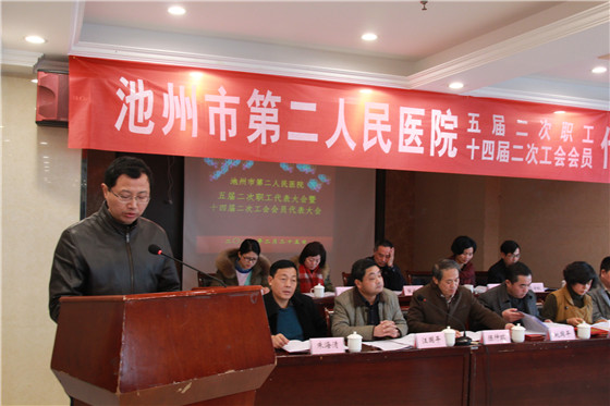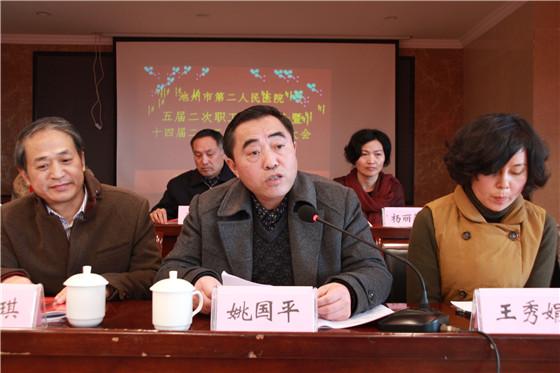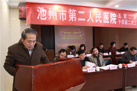 2月25日上午,池州市第二人民医院五届二次职工代表大会暨十四届二次工会会员代表大会在秀山国际大酒店五楼会议室隆重召开。93名职工代表肩负着医院改革发展的历史重任,以饱满的热情,为谋划医院宏伟蓝图凝心聚力。区卫计委副书记姚国平、区总工会副主席王秀娟、区卫生系统工会主席姚林列会祝贺。会议由副院长汪国平主持。
