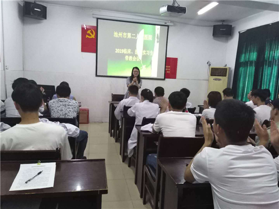 会上,程科长首先介绍了带教负责人、实习同学,随后以PPT的形式从医院历史、医院规模、医院科室、医院环境、医院硬件、医院文化等方面介绍了医院详细情况,并着重介绍了科教科的工作职能,她希望各科室教学负责人严格按照《实习大纲》和各科室具体特点制定教学计划,实施带教,认真完成出科考试、考核任务,并积极将医学人文贯穿在带教过程中。