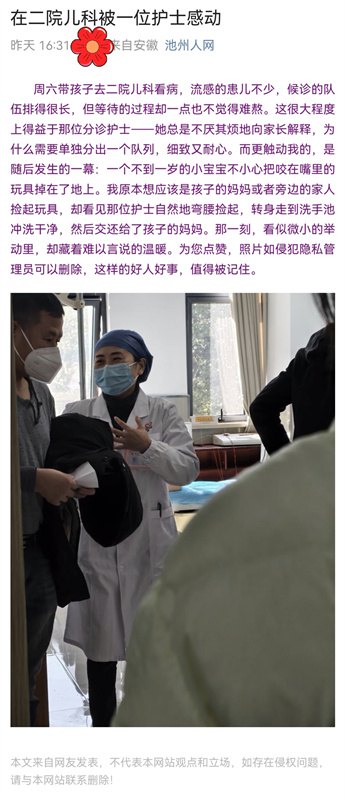 近日,我院门诊部护士长陆玉娟在儿科分诊台前的一温暖举动,被就诊患儿的家长记录并分享至本地论坛,引发网友共鸣。