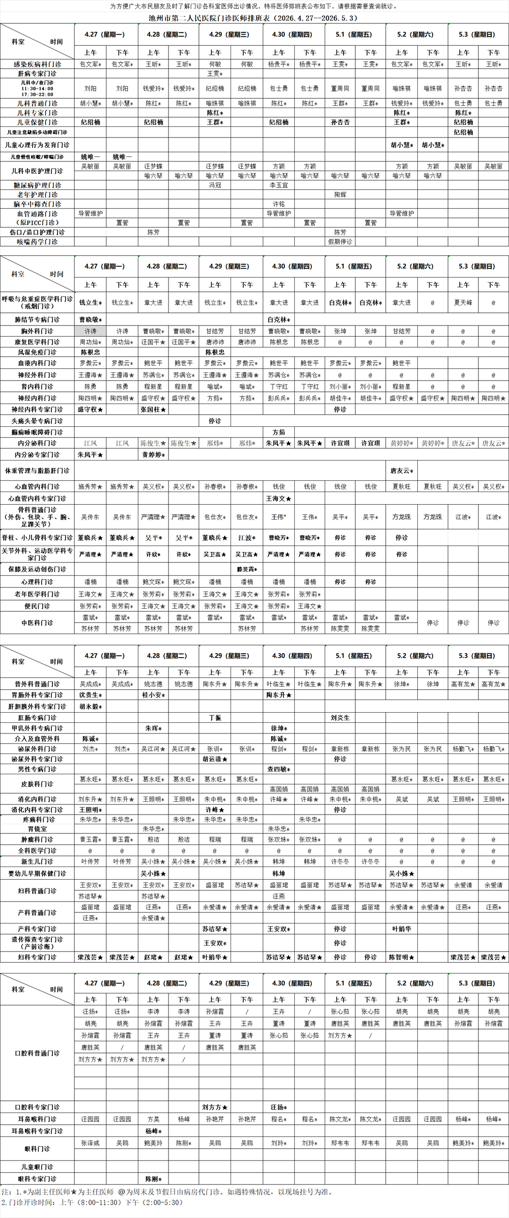 >> 池州市第二人民医院门诊医师排班表(2026.4.27--2026.5.3)